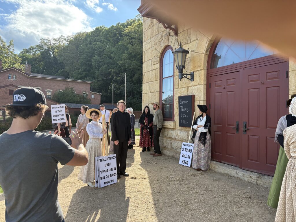 BEN’S IN A MOVIE August 22, 2025 by Clare Duffy Quiet on set! Ben and his fellow actors about to film a scene. They dressed Ben as an 1880’s farmer. Peep the chest hair.