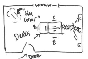 Eric…can’t draw things that don’t look dirty. The “Idea Corner” is a table and chairs. The melons on the wall are actually sconces. Why, what did you see?